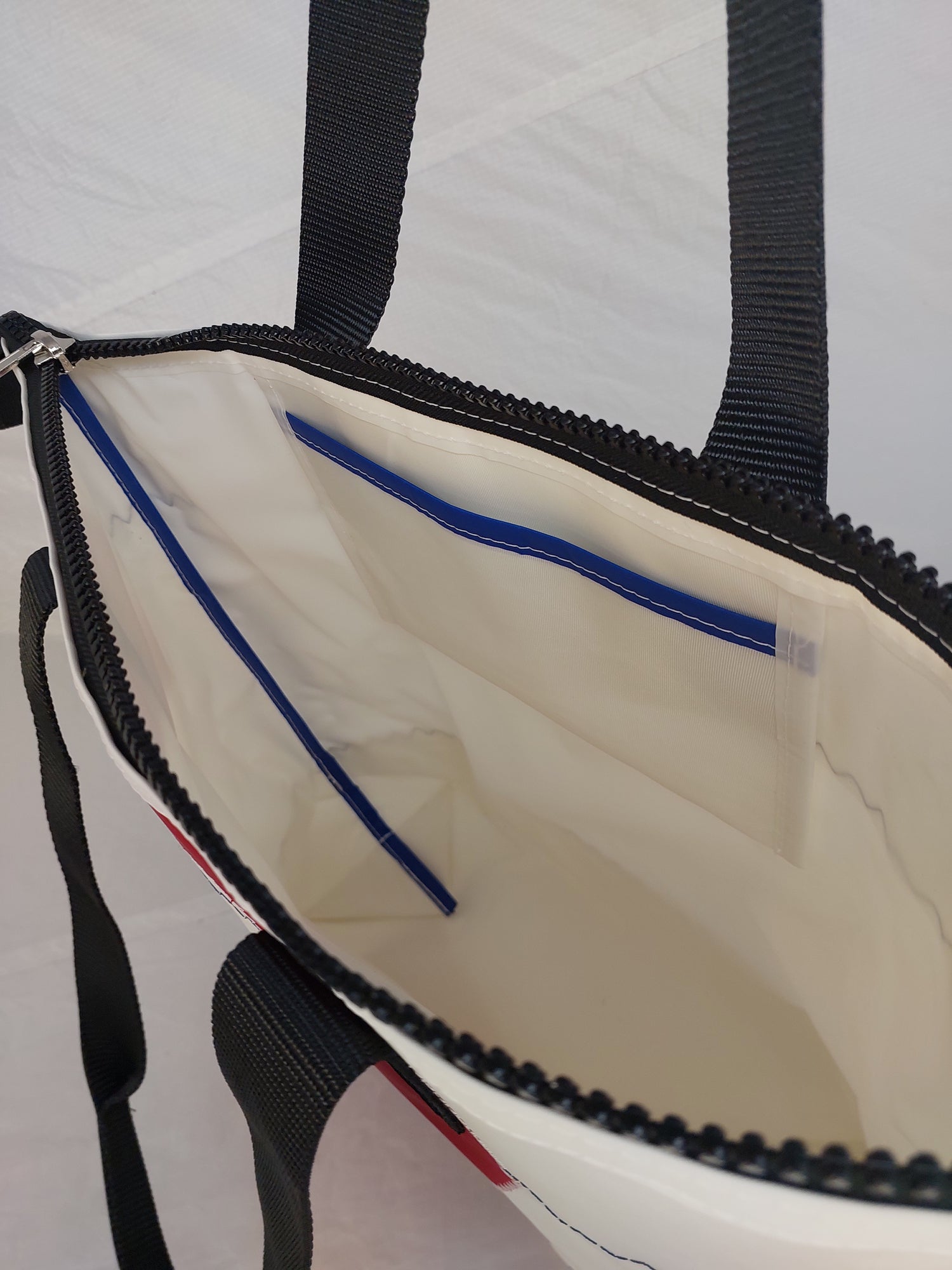 A white dacron sail with white polyester lining. Featuring sailmaker webbing handles, dacron tape trim and an internal slip pocket. We only use the best YKK marine zip.