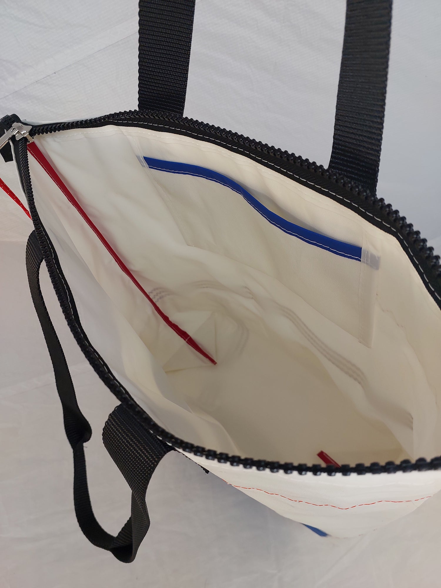 A white dacron sail with white polyester lining. Featuring sailmaker webbing handles, dacron tape trim and an internal slip pocket. We only use the best YKK marine zip.
