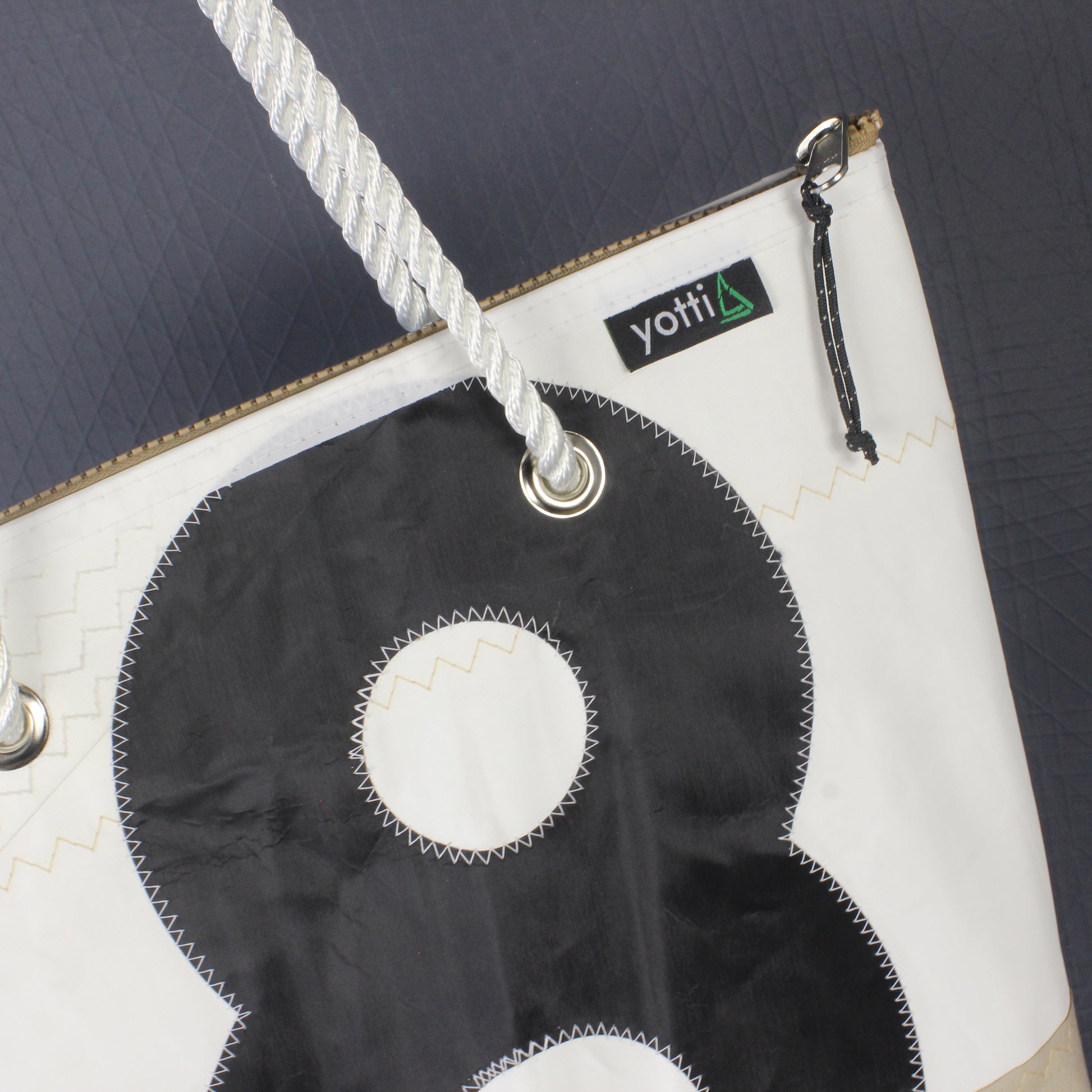 A Dacron sail fabric with a tan canvas base and lined with white polyester. Featuring traditional three strand rope handles, dacron tape trim and an internal slip pocket.