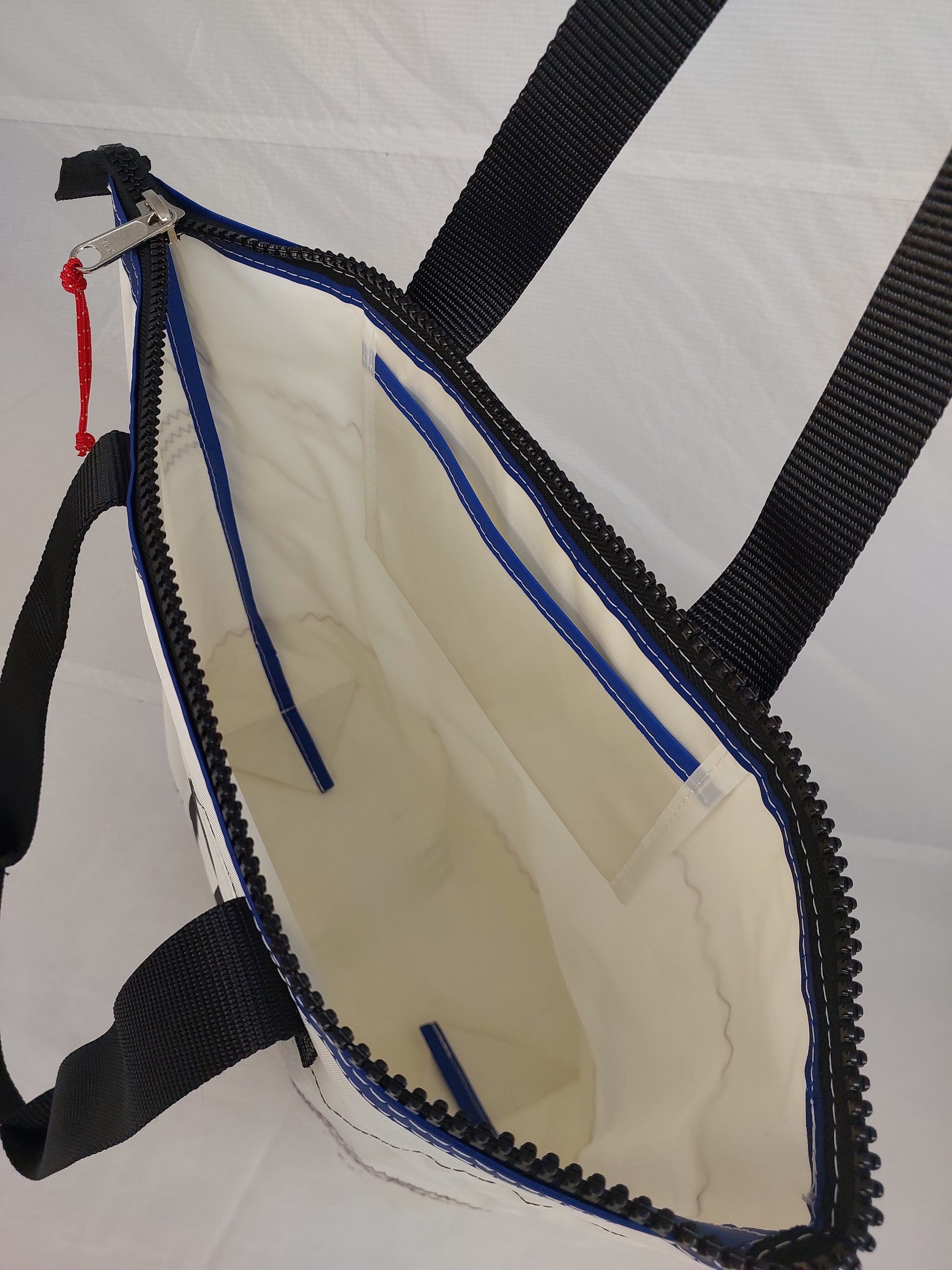 A white dacron sail with a white polyester lining. Featuring sailmaker webbing handles, dacron tape trim and an internal slip pocket. We only use the best YKK marine zip.