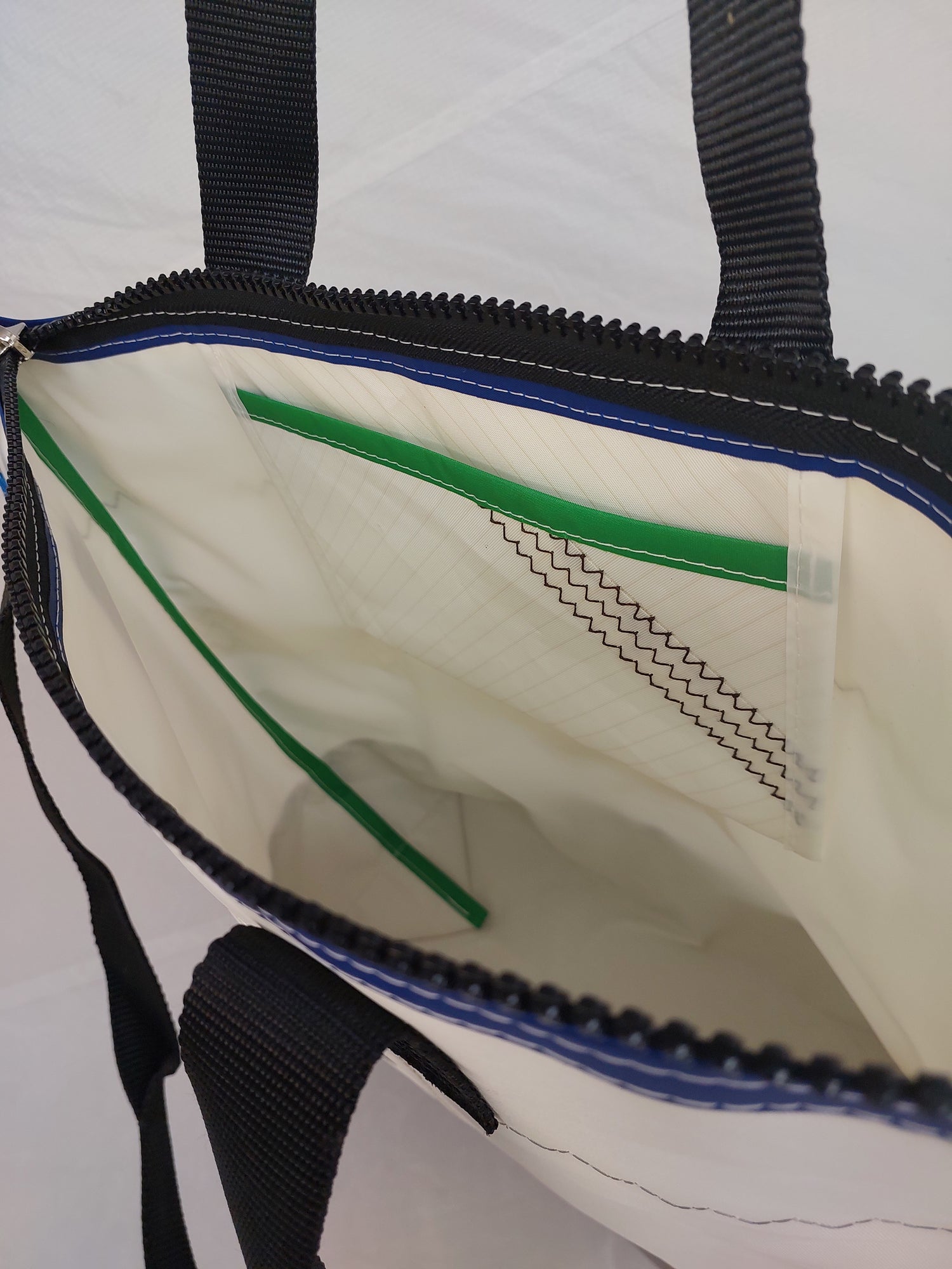 A white dacron sail with a white polyester lining. Featuring sailmaker webbing handles, dacron tape trim and an internal slip pocket. We only use the best YKK marine zip.