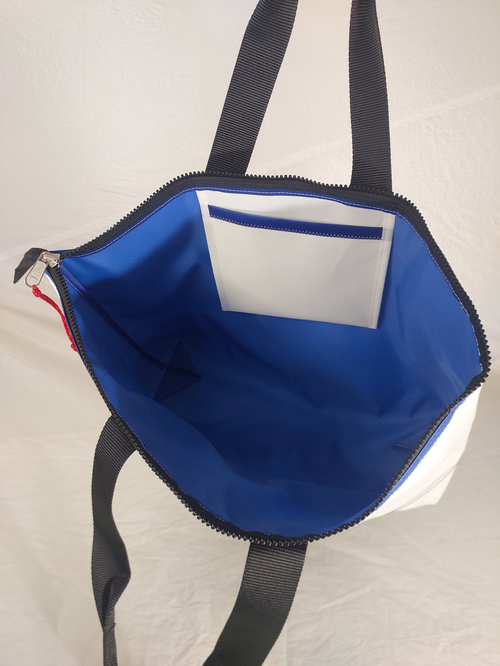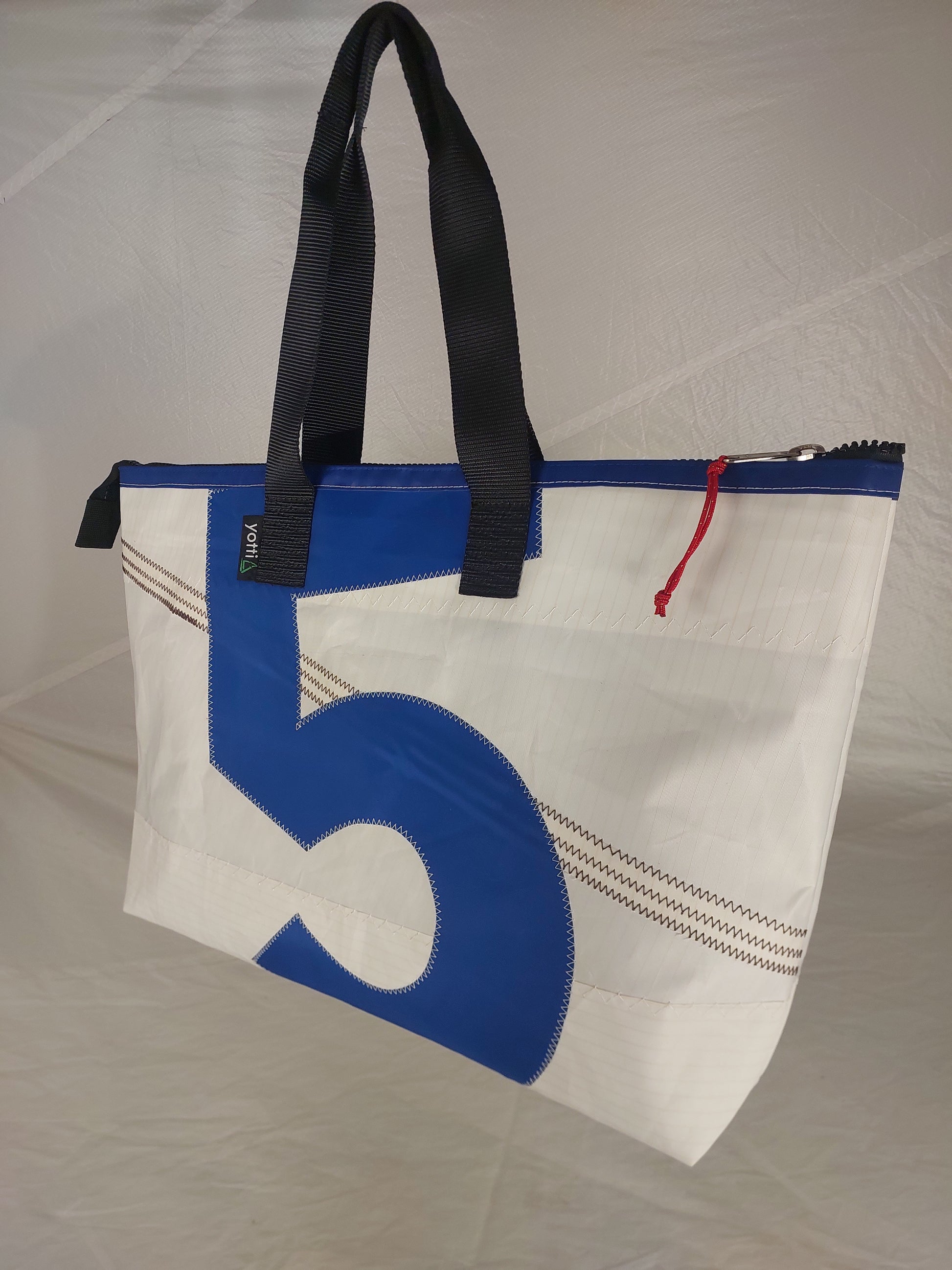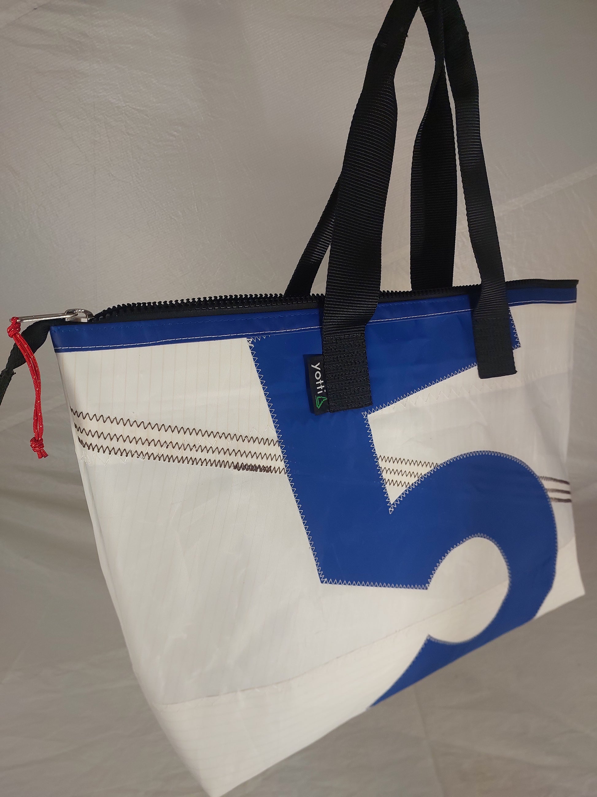 A limited trial run of oversized totes brings you the Number 5 Hold-all tote—built for those who need to stow more without sacrificing style. Same height as our standard zip top boat tote, just more of it. Dimensions: 50cm long, 15cm wide, 40cm tall. Crafted from authentic white dacron sail fabric with a light tan pinstripe and blue polyester lining. Features extra-wide 50mm sailmaker webbing handles, dacron tape trim, and an internal slip pocket. Secured with premium YKK marine-grade zip that is built to withstand the elements. Each tote carries its own maritime heritage—these sails have weathered real voyages. We wash away the salt, leaving behind character marks and perfect imperfections that tell the story of life at sea. No two are alike.